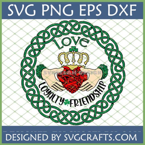 Our meticulously crafted Claddagh Ring SVG Design features the classic Irish symbol—two hands cradling a heart, topped with a crown—elegantly encircled by an intricate Celtic knot. This design goes a step further by explicitly integrating the words “Love,” “Loyalty,” and “Friendship” within the knotwork, ensuring its powerful message is clear. A subtle shamrock adorns the crown, adding an extra touch of Irish charm and making it perfect for St. Patrick’s Day or any celebration of Irish culture.