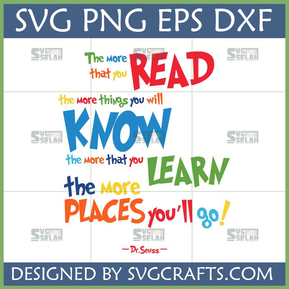 Our Dr Seuss Reading Quote SVG brings to life the beloved lines: The more that you READ, the more things you will KNOW. The more that you LEARN, the more PLACES you’ll go! This design is a visual celebration of discovery and intellect, featuring: