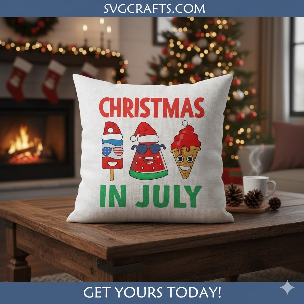 - Typography: The bold, friendly “CHRISTMAS” in red and “IN JULY” in green text clearly conveys the design’s playful message.
