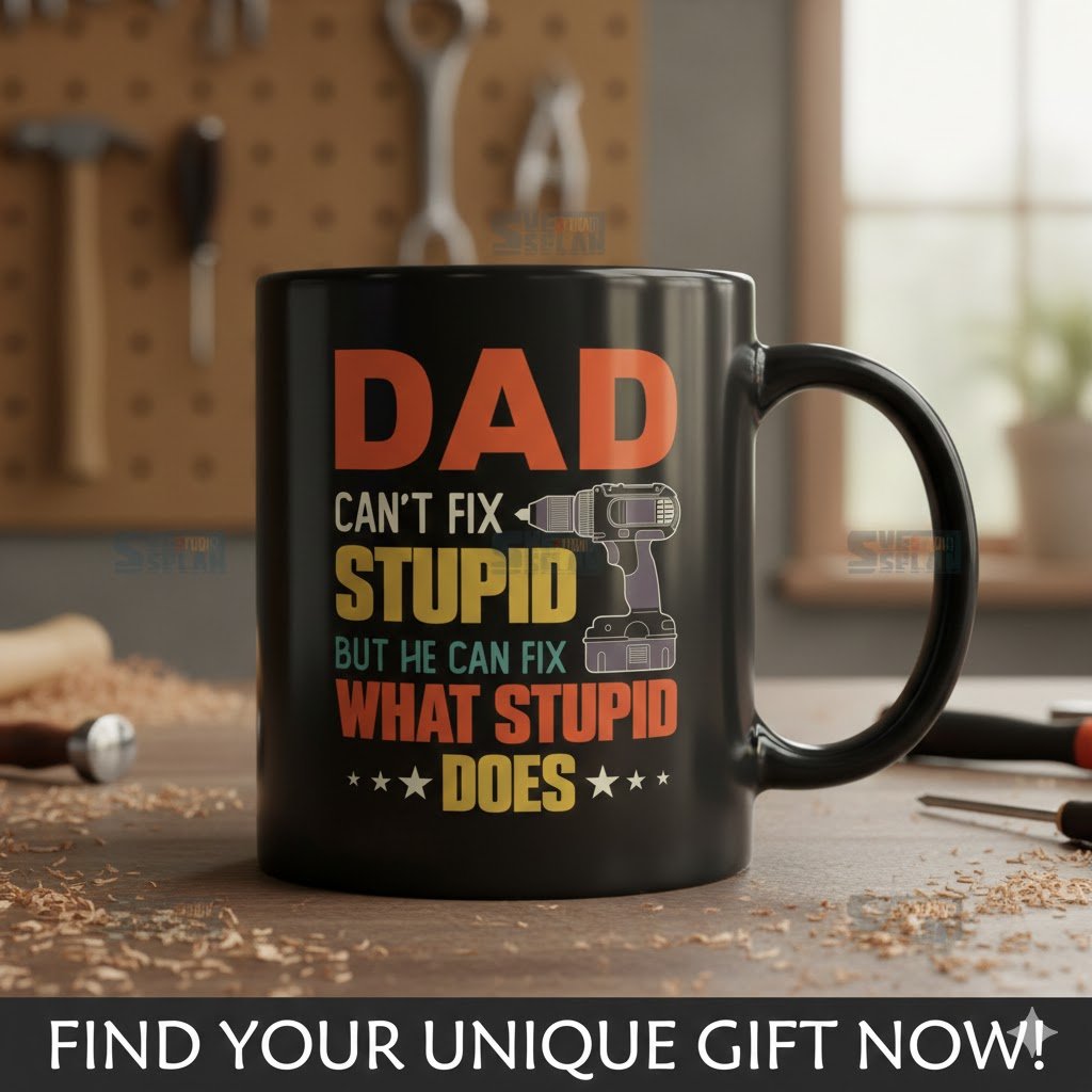- Key Phrase: The bold statement “DAD CAN’T FIX STUPID BUT HE CAN FIX WHAT STUPID DOES” is the heart of the design, instantly resonating with anyone who has a handy father.