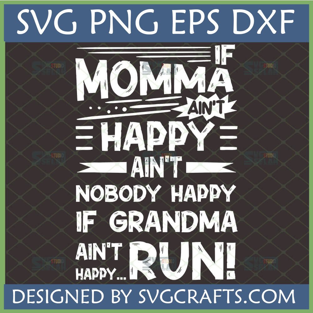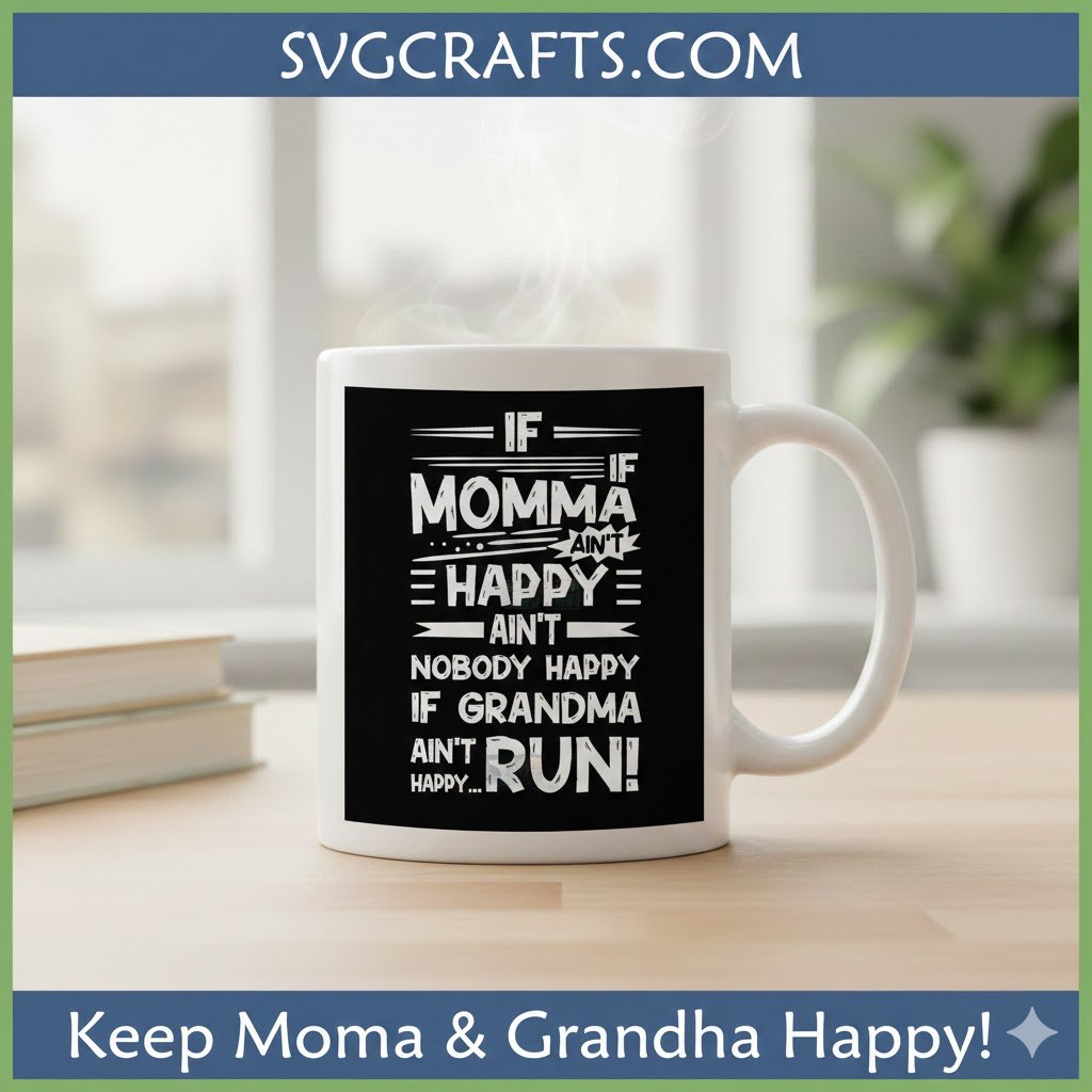 - Witty Quote: Features the full humorous saying ‘IF MOMMA AIN’T HAPPY AIN’T NOBODY HAPPY IF GRANDMA AIN’T RUN!’