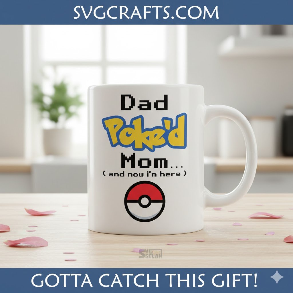 Announce your new arrival with a smile! This Funny Pokemon Pregnancy Announcement SVG features ‘Dad Poke’d Mom… (and now I’m here)’ with a retro gaming vibe and iconic Pok Ball, perfect for Cricut and Silhouette projects, t-shirts, mugs, and unique baby reveal gifts for gamer parents. Instant digital download!