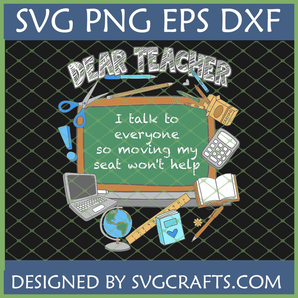 Brighten an educator’s day with our hilarious Funny Teacher SVG Design! Featuring the witty quote ‘Dear Teacher, I talk to everyone so moving my seat won’t help’ with charming school doodles, this digital file is perfect for creating unique teacher appreciation gifts, custom apparel, and classroom decor with your Cricut or Silhouette machine.
