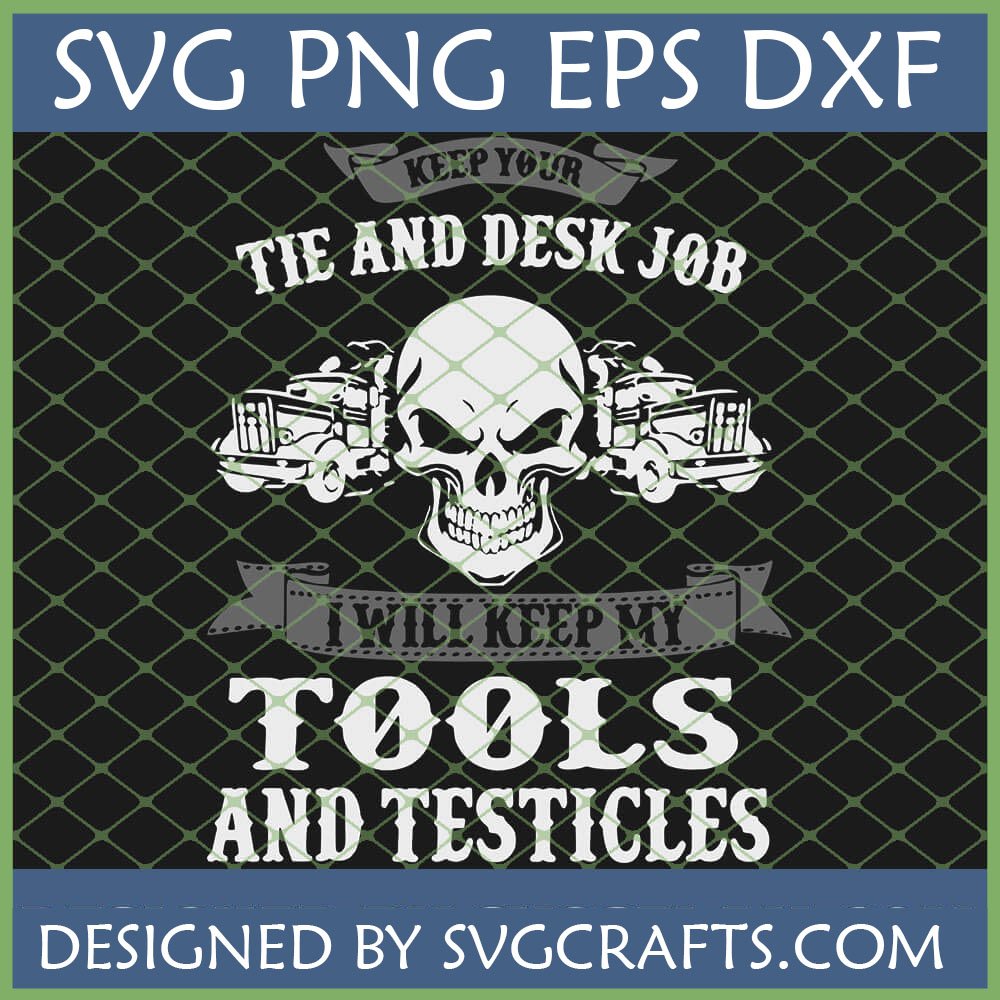 - Bold Typography: The impactful phrases “KEEP YOUR TIE AND DESK JOB” and “I WILL KEEP MY TOOLS AND TESTICLES” are rendered in a strong, masculine font, leaving no doubt about the wearer’s priorities. This is a quintessential anti desk job SVG.