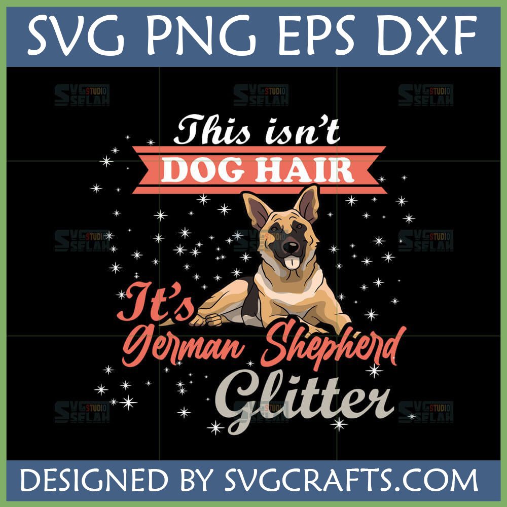 – Bold, contrasting typography uses a playful script for ‘This isn’t’ and ‘It’s German Shepherd Glitter‘, paired with a strong block font for ‘DOG HAIR’, emphasizing the humorous twist.