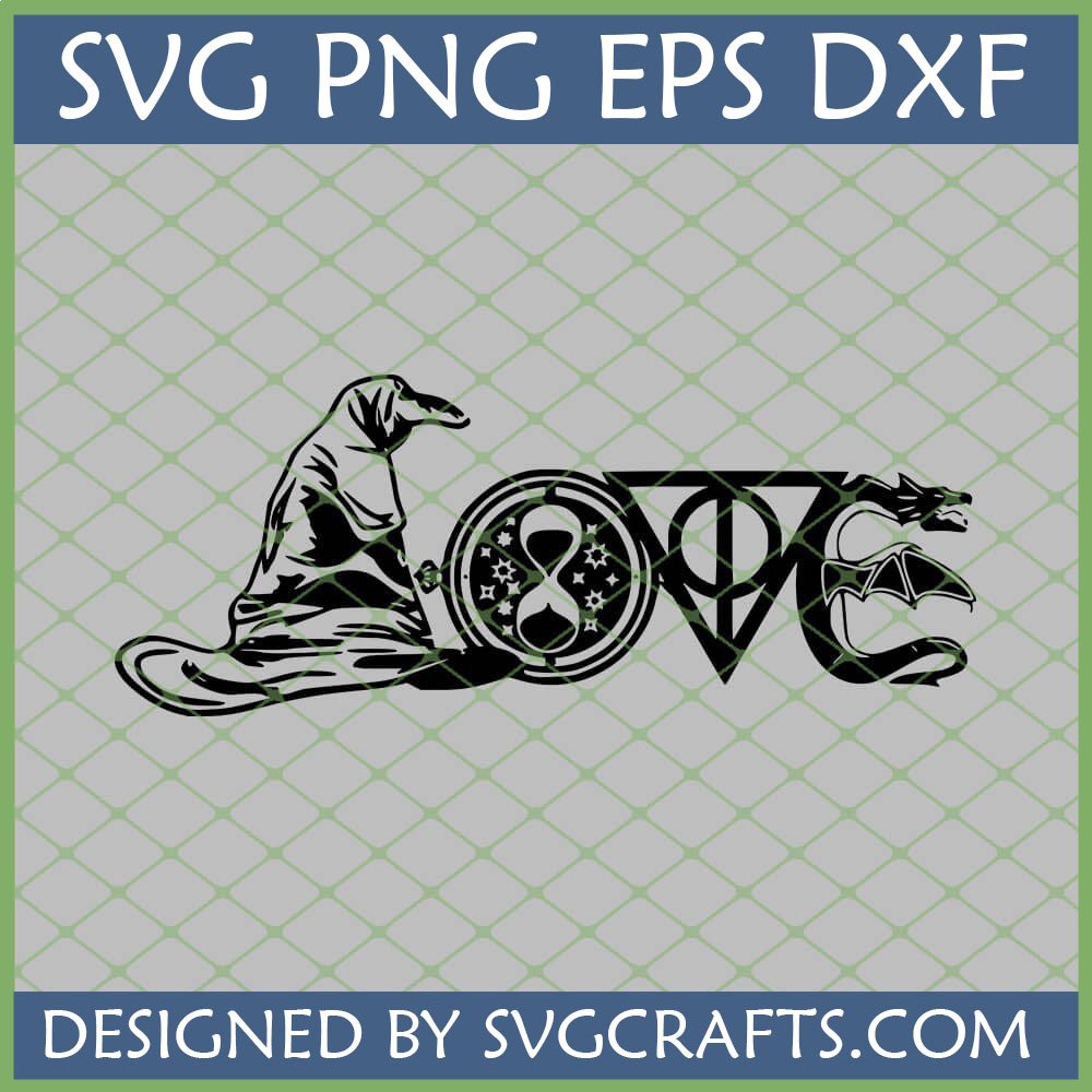 A: Each letter in the Harry Potter Love SVG File design is crafted from an iconic wizarding world element. The ‘L’ is a wizard’s hat, the ‘O’ is a magical orb with an hourglass, the ‘V’ is the Deathly Hallows symbol, and the ‘E’ is a majestic dragon’s head and wing.