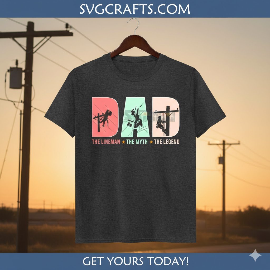 * Striking Typography: The word “DAD” is the centerpiece, with each letter uniquely incorporating detailed silhouettes of linemen actively working on utility poles, symbolizing their constant dedication.