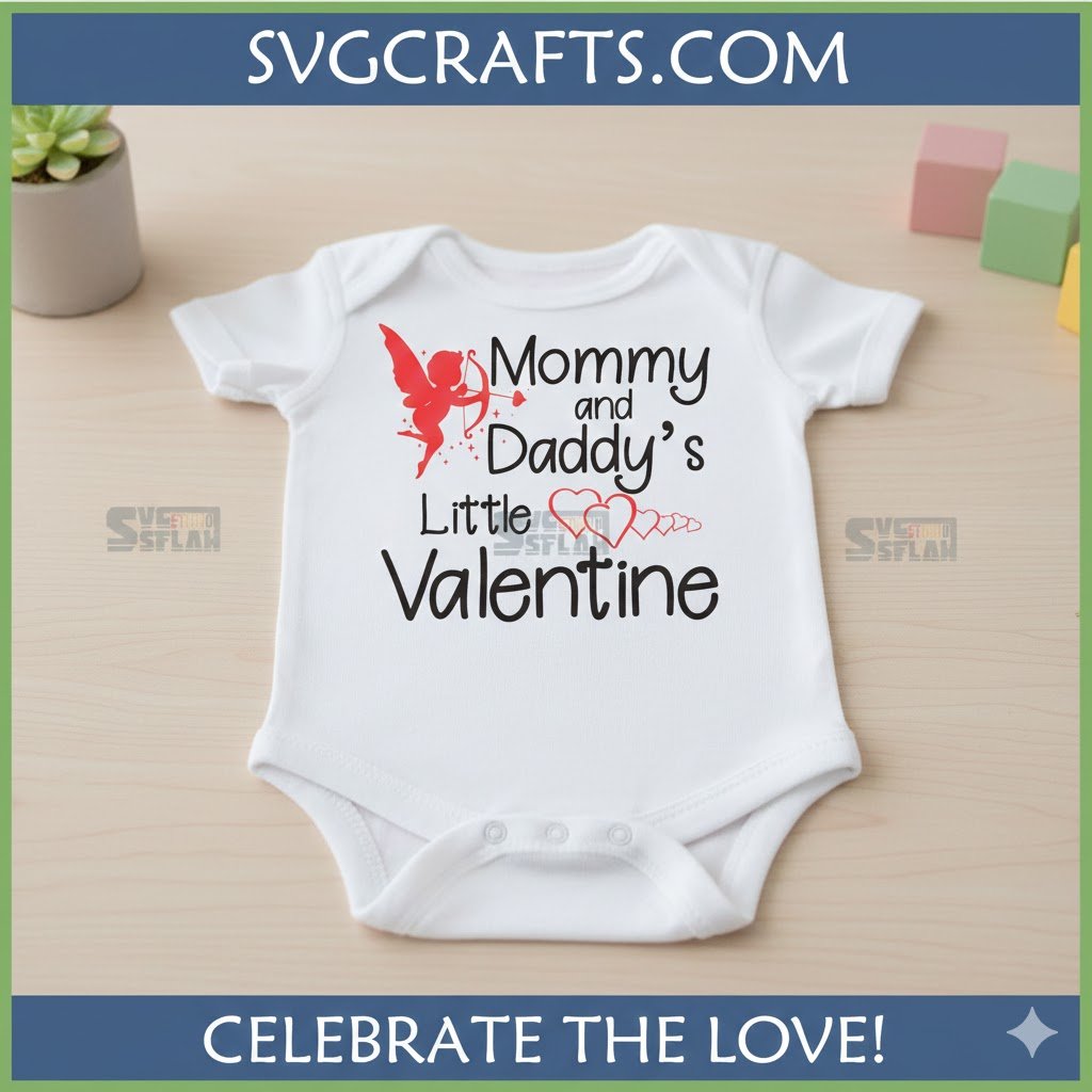 This design fits perfectly within popular crafting and parenting trends. It’s ideal for those who love creating with Cricut and Silhouette machines, and for parents who adore brands like Carter’s and Gerber for their baby apparel blanks. Join the festive spirit of #BabysFirstValentine, #LittleValentine, #MommyAndMeValentines, and #DaddyAndMeLove by incorporating this charming design into your projects. It also resonates with the broader “Family Love” and “New Parent Journey” niches.