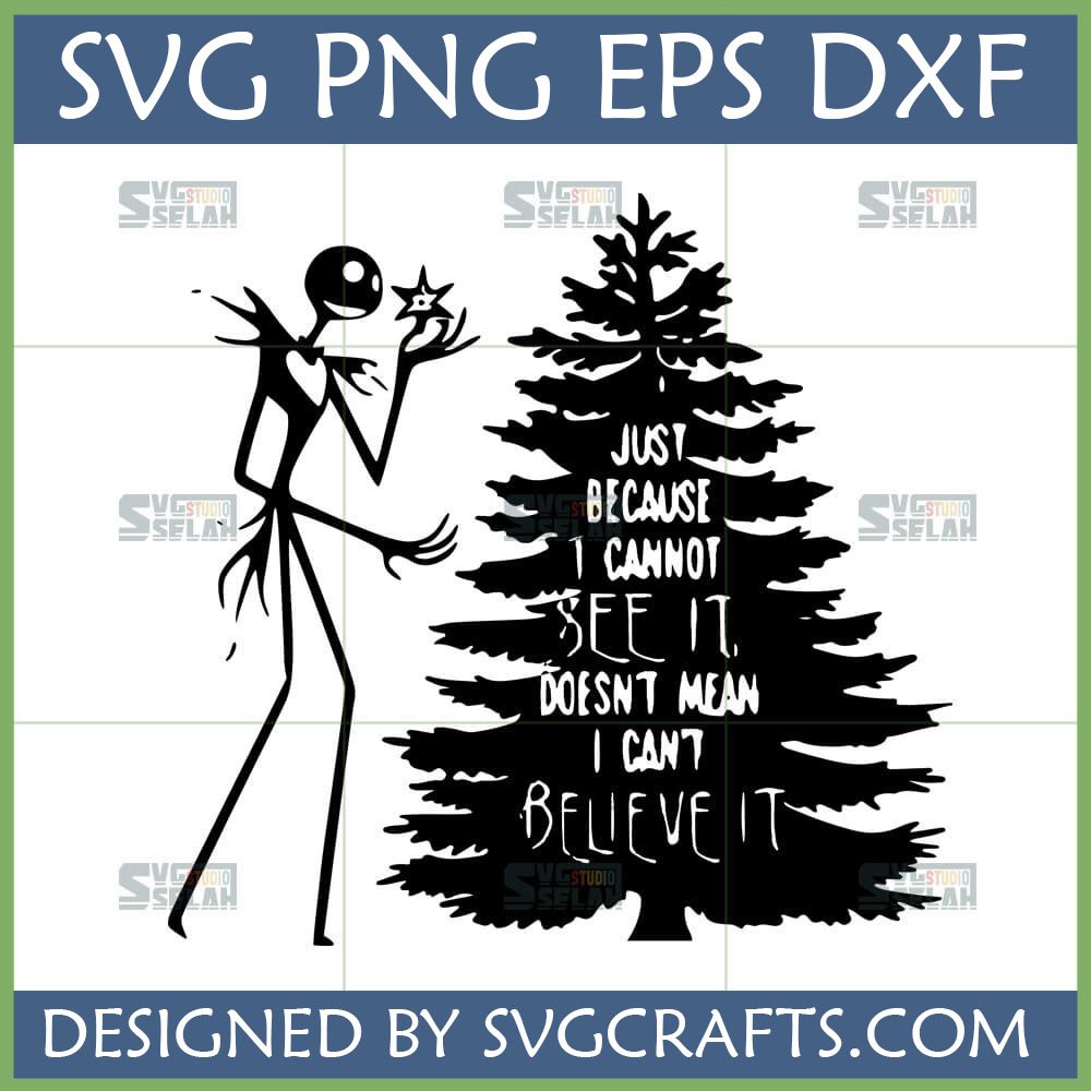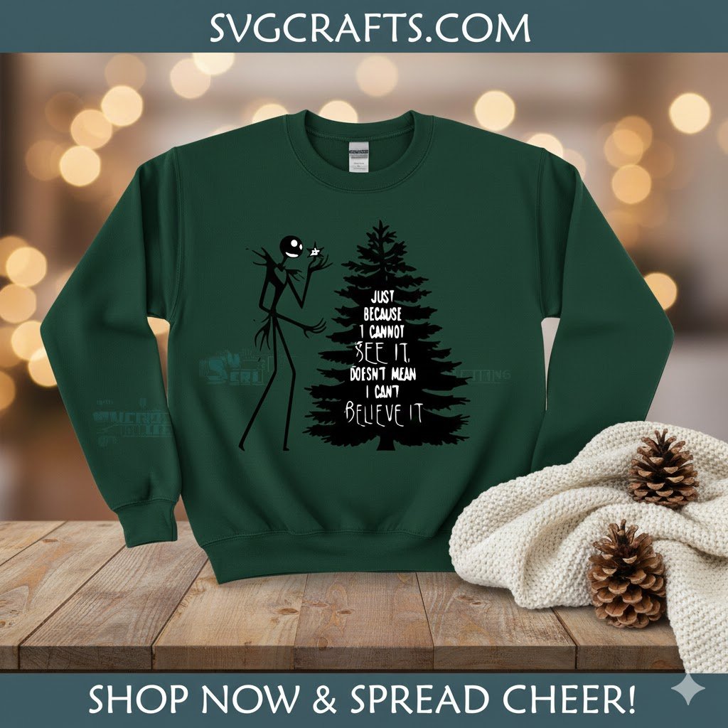 A: The quote “JUST BECAUSE I CANNOT SEE IT, DOESN’T MEAN I CAN’T BELIEVE IT” perfectly embodies Jack Skellington’s character and his journey of discovering Christmas. While not a direct quote from the movie, it captures his spirit of wonder and belief in the unseen, making it profoundly meaningful for holiday designs.