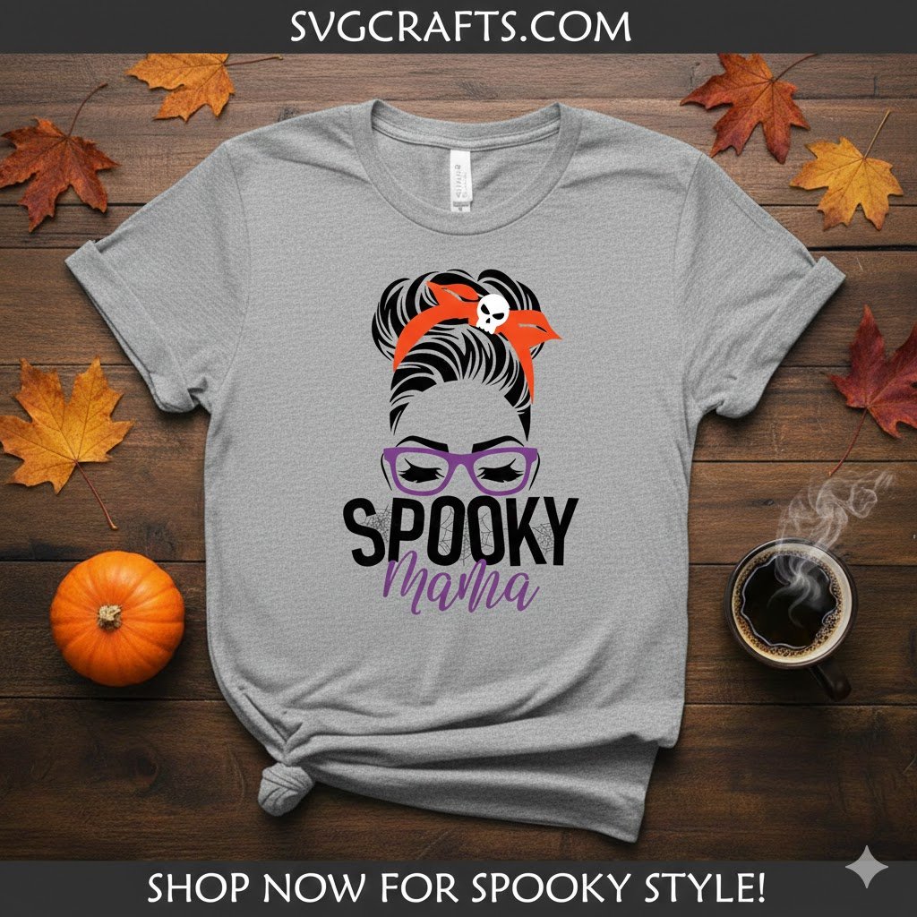 Embrace your inner ‘ghoul-mom’ with our vibrant Spooky Mama SVG! This unique digital file features a trendy messy bun, purple glasses, and a skull-adorned bandana, perfect for crafting personalized Halloween T-shirts, mugs, and gifts for the ultimate festive mom.